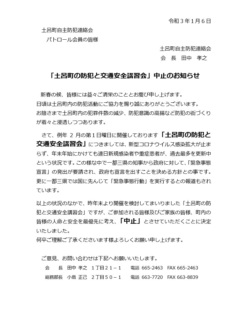 令和3年1月16日開催予定。防犯と交通安全講習会中止のお知らせ